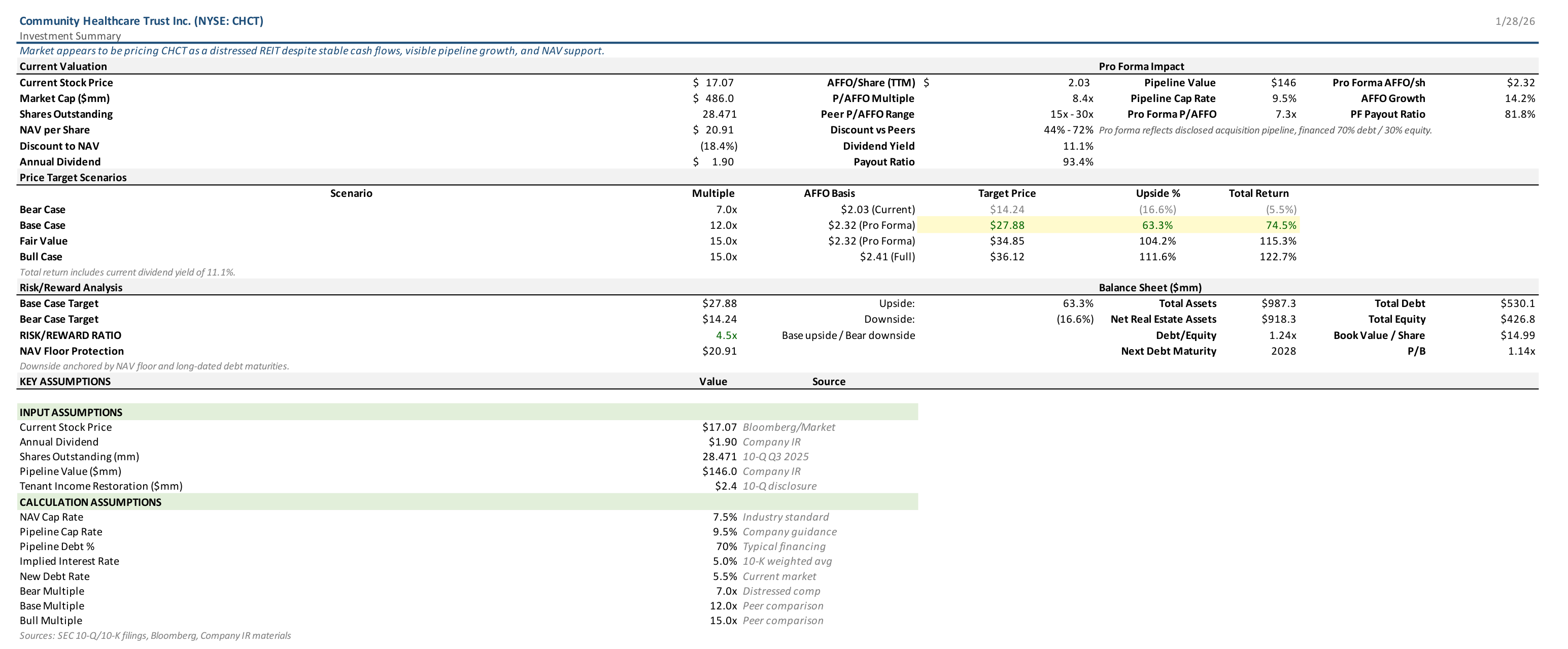 CHCT is trading at $17.07, about 8.4 times trailing AFFO and at just over 80% of conservative NAV, with an 11% dividend yield. The market's pessimism is visible in every metric and scenario. The company is priced as if distress is certain, but the model and business facts suggest a stable, cash-flowing landlord with a pipeline of accretive growth opportunities. If the company executes as planned and the market simply reverts to valuing the business at a discounted but non-distressed multiple, the upside is significant and the downside is limited by recurring cash flows and asset value. The bet is not that CHCT is perfect, but that the market's embedded risk premium and pessimism are too large relative to the actual risks documented in the cash flows, pipeline math, and NAV sensitivity. The thesis is thus not an appeal to optimism, but a claim that the current valuation already reflects a bundle of negative assumptions that are difficult to justify against the factual economics of the business.